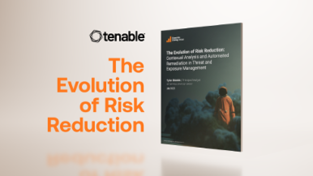 Tenable logo on gray background with the words "The Evolution of Risk Reduction" and a screenshot of the Enterprise Strategy Group Report "The Evolution of Risk Reduction: Contextual Analysis and Automated Remediation in Threat and Exposure Management"