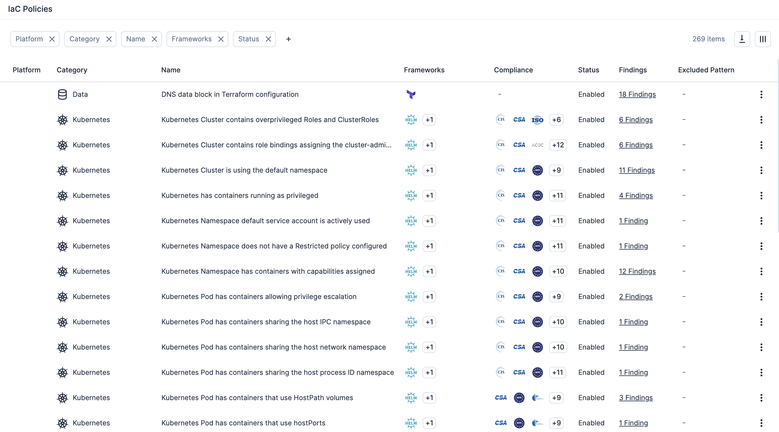 Effettua la scansione continua in AWS, Azure, OCI, GCP e Kubernetes per rilevare configurazioni errate, violazioni di policy e risorse esposte pubblicamente, al fine di far emergere i rischi in tempo reale.